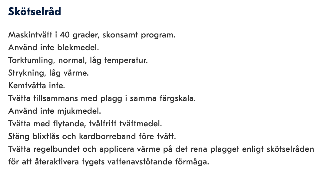 • Följ säkerhetsråden för tvätt och hantering (se nedan)